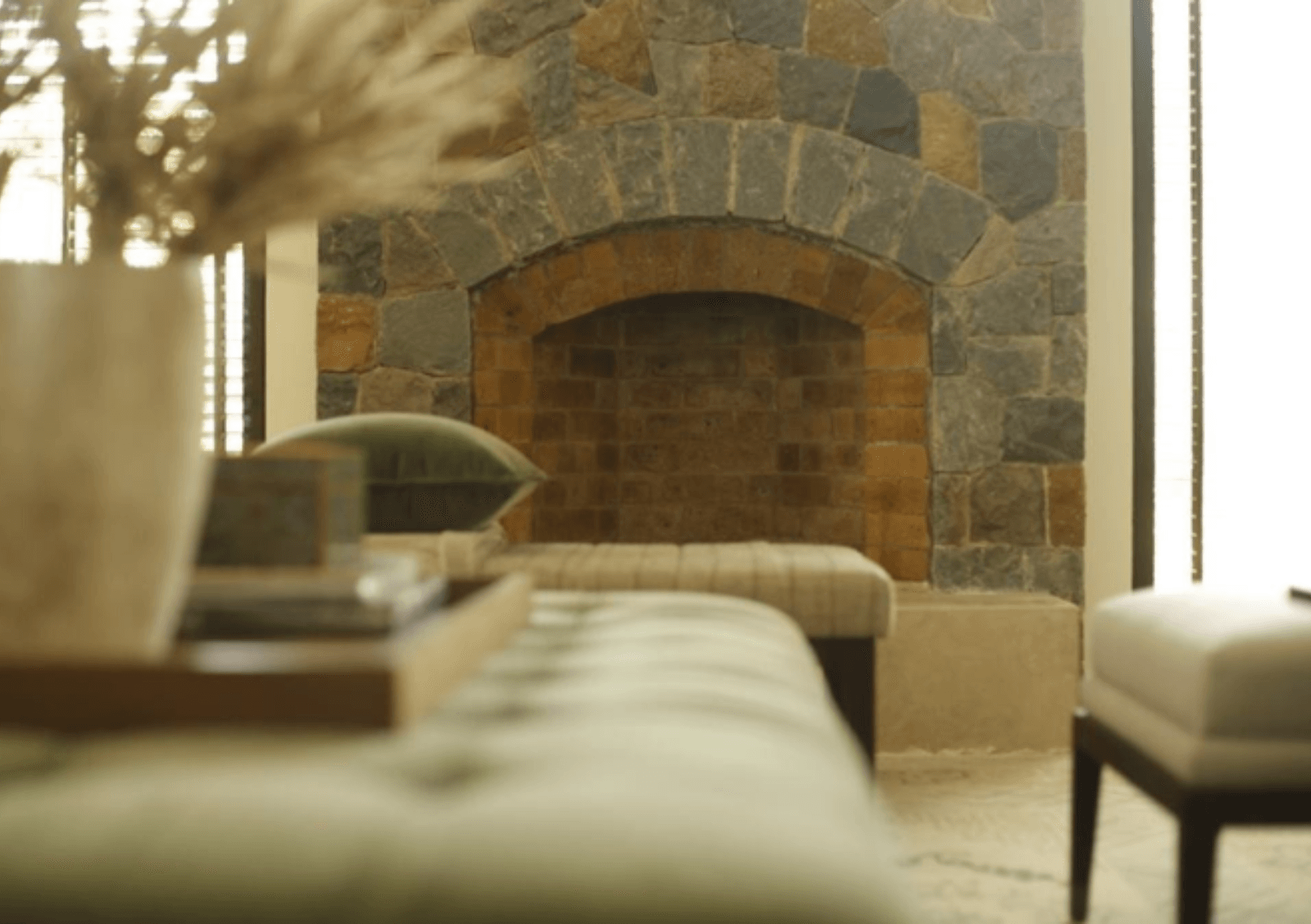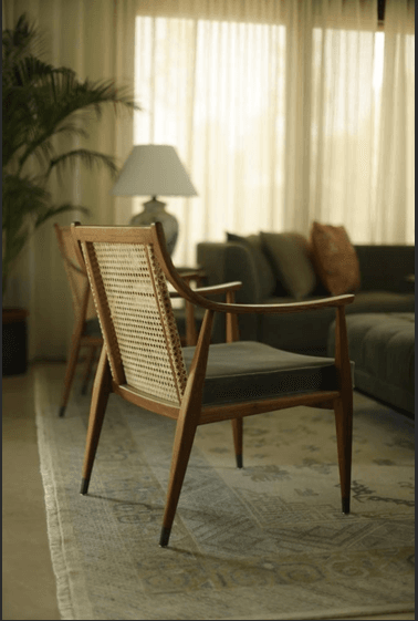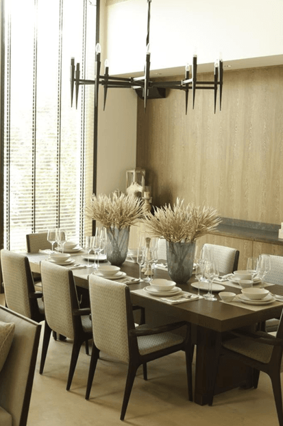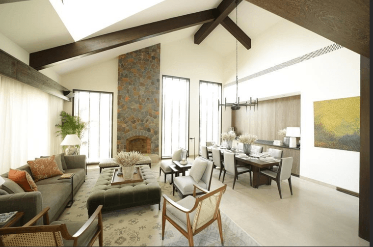The living room is fairly large, and the dining room is double height. This 5000 sq. ft. 4 bedroom duplex has a fairly large living room and a double-height dining room. The clients are empty nesters, and their brief was to design a home for themselves that was cozy, soothing, modern, luxurious, and minimalist. They both have green thumbs and needed enough space indoors and out to accommodate their current plants. They also stated their preference for natural materials, such as natural teak wood for furniture and natural breathable fabrics